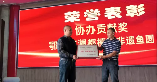 这一刻,舞台上的澜都禧宴非遗鱼圆牌匾,在灯光的映照下,闪耀着金色的光芒,仿佛在诉说着鱼圆背后的故事,诉说着鄂州非遗文化的魅力与传承 。它成为了大会现场的焦点,吸引着众多嘉宾纷纷拍照留念。他们用相机定格下这一荣耀时刻,也将鄂州非遗鱼圆的美名传播得更远 。