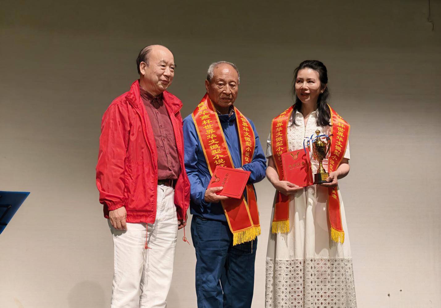 世界华文微型小说研究会会长凌鼎年先生向汤群女士颁发首届“华燕杯”微型小说征文大赛一等奖,向吕顺颁发首届“华燕杯”微型小说征文大赛荣誉奖。澳洲另有西贝、经年鲤获奖(2025年12月7日下午)