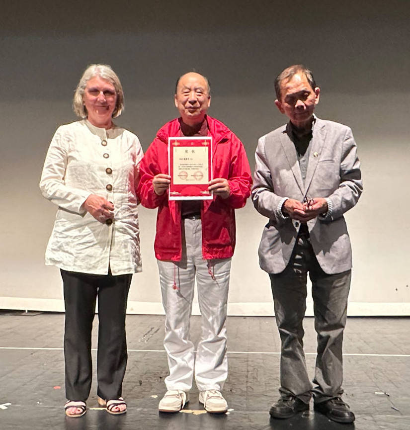 亚拉巿前市长Amanda Stone女士 与澳大利亚前人民大使Chap Chow 为凌鼎年先生颁奖,表彰他16年来为澳洲华文微型小说创作和发展做出的贡献(2025年12月7日下午)