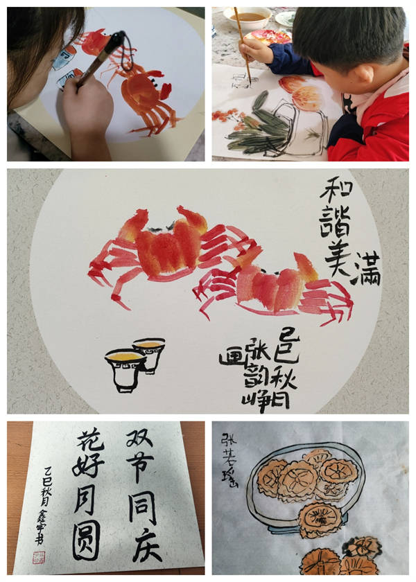 活动现场暖意融融,孩子们化身“小小书画家”,以纸为卷、以笔为媒,将对双节的祝福与对祖国的热爱落于笔端。有的挥毫写下“月满中秋 国庆添喜”“国泰民安 花好月圆”,稚嫩笔触满含真挚祝愿;有的绘就“花好月圆”“祖国万岁”等主题画作,色彩明快间尽显童真与赤诚;还有孩子以写意螃蟹入画,借“蟹”谐音“谐”,寓意家庭和谐、生活美满。一幅幅作品,既是孩子们对双节的祝福,更是对祖国繁荣昌盛的深情礼赞。