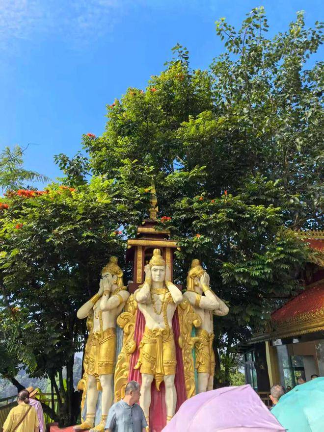 我们沿金塔绕行三周,迎面是一组“人间清醒”神像——依我理解,喻示着不恶口、不妄听、不为恶行。