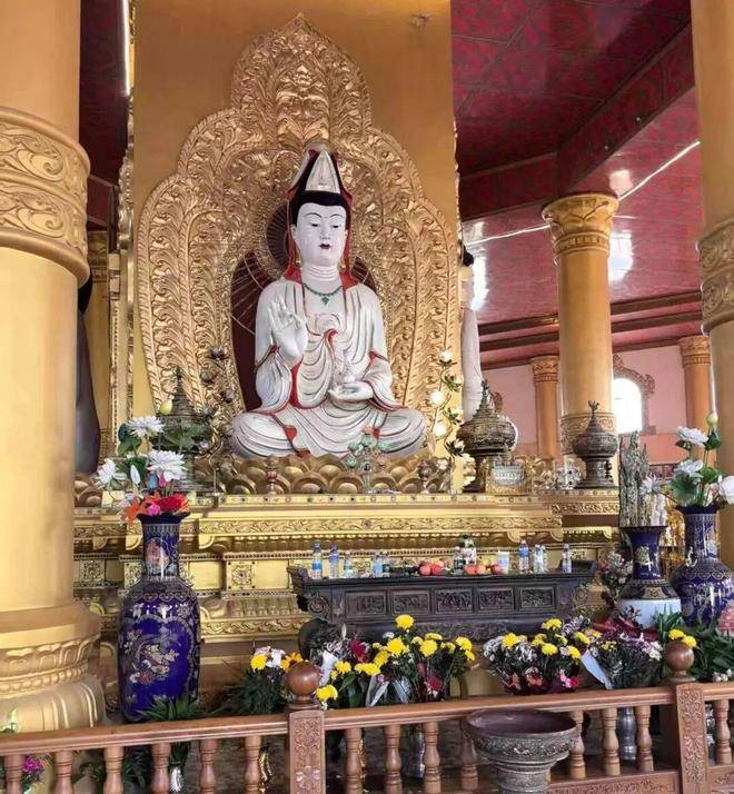 我们脱鞋赤足,步入金塔大殿,虔诚参拜。殿高三十余米,恢弘庄严、金碧辉煌。四尊汉白玉大佛——两尊如来佛祖、一尊观世音菩萨、一尊弥勒佛——肃穆巍峨,含笑垂目,令人肃然起敬。