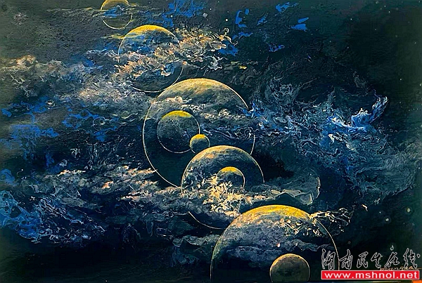 此次展出的《叩问苍穹》系列,以写意宇宙的恢弘图境致敬人类探索精神;《超意识主义图腾》则通过强烈的情绪表达,成为映照全球问题的精神镜像,实现“雅者品其神,俗者赏其形”的艺术境界。