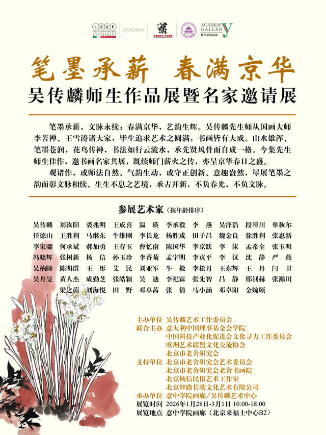 打造新春文化盛宴,传承中华艺术文脉。甲辰岁末,丙午春临。2026年1月28日,“笔墨承薪 春满京华——吴传麟师生作品展暨名家邀请展”在北京来福士中心意中学院画廊正式启动。展览由吴传麟艺术工作委员会主办,意大利中国理事基金会学院、中国科技产业化促进会文化寻力工作委员会、欧洲艺术联盟文化交流协会、北京市老舍研究会联合主办,汇聚海内外60余位艺术家的精品力作,以书画艺术为媒,为京城新春注入浓郁的文化气息。